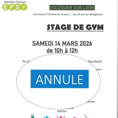 STAGE DE GYM LE 14 MARS 2026 DE 10 h 00 à 12 h 00 Au gymnase de Ouzouer-sur-Loire Inscriptions jusqu’au 10 mars 2026