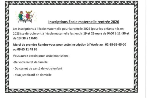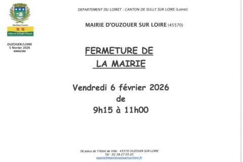 Fermeture de la MairieVendredi 6 février 2026 9h15 à 11h00Lire la suite Colis Repas SurprisePour la sixième année consécutive, l’Hospitalité Diocésaine d’Orléans propose de commander un Colis Repas Surprise...Lire la suite Inscriptions École maternelle rentrée 2026Les jeudis 19 et 26 mars 2026 9h à 11h30 et 13h30 à 17h00 Prendre rendez-vous pour cette inscription à l’école au...Lire la suite Inscription liste électoraleAvant le 6 février 2026 à votre mairie (format papier) Avant le 4 février 2026 en ligne Lire la suite Soirée TropicaleSamedi 7 mars 2026 À partir de 19h Salle Ballot Réservation avant le 22 février au 06-61-60-40-99Lire la suite Conférence DédicacesDimanche 1er février 2026 11h Foyer Carnot Animé par Stein Van OosterenLire la suite Journée de prévention des chutesVendredi 20 mars 2026 10h à 17h Hôpital de Sully-sur-LoireLire la suite Soirée DiscoLe samedi 21 mars 2026 Salle Ballot Renseignements et réservation au 06-50-06-25-44 ou 06-08-10-88-52Lire la suite 1 2 3 4 »