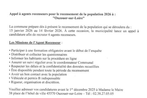 Dépistage de la dénutrition à domicileMercredi 3 décembre 2025 14h à 16h Salle commune – Résidence Les Coquelicots – 45570 OUZOUER-SUR-LOIRE Inscription crt.loiret.sudest@ch-gien.fr 02-38-29-38-53Lire la suite Candidature agents recenseursAppel à candidature afin de recruter 6 agents recenseurs Pour le recensement de la population 2026 à Ouzouer-sur-LoireLire la suite Permanence Croix RougeMercredi 1er, 15 et 29 octobre 2025 Mercredi 12 et 26 novembre 2025 Mercredi 10 et 24 décembre 2025 Place du ComiceLire la suite « 1 2
