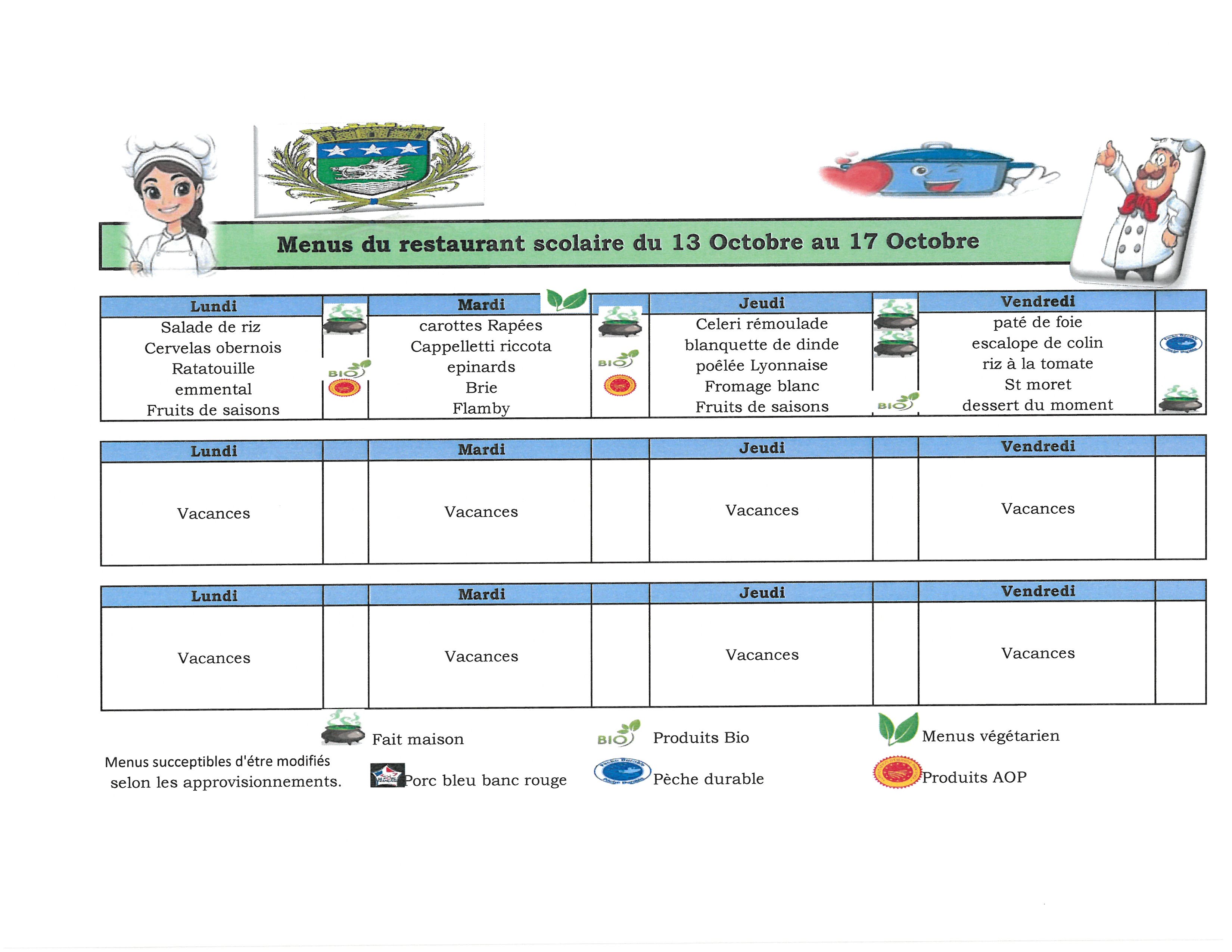 Menus du restaurant scolaire du : 13 octobre au 17 octobre 2025